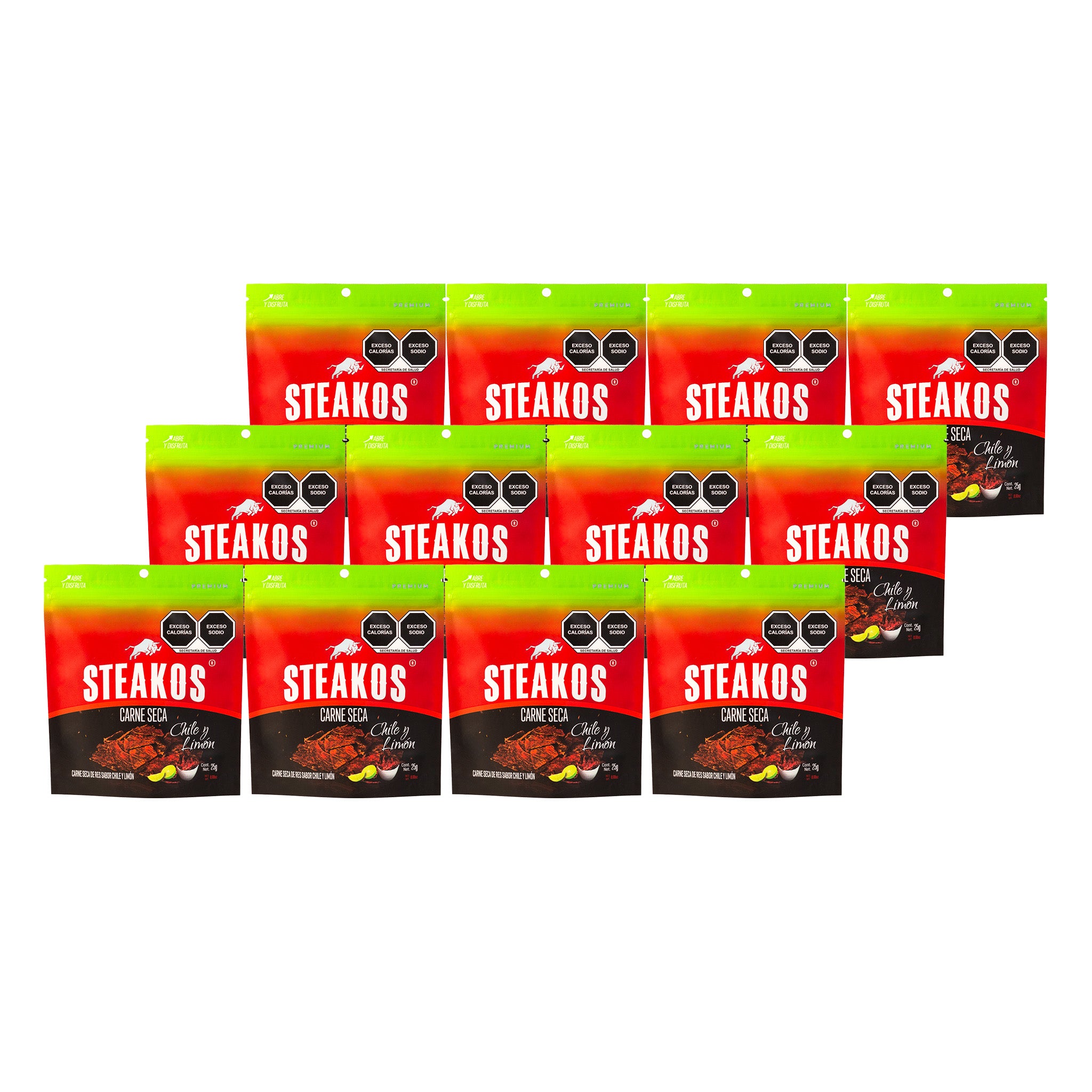 Contenido de la caja: 12 piezas de Steakos carne seca Receta Original de 25g c/u.